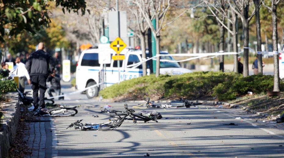 Multiple bikes are crushed along a bike path in lower Manhattan in New York